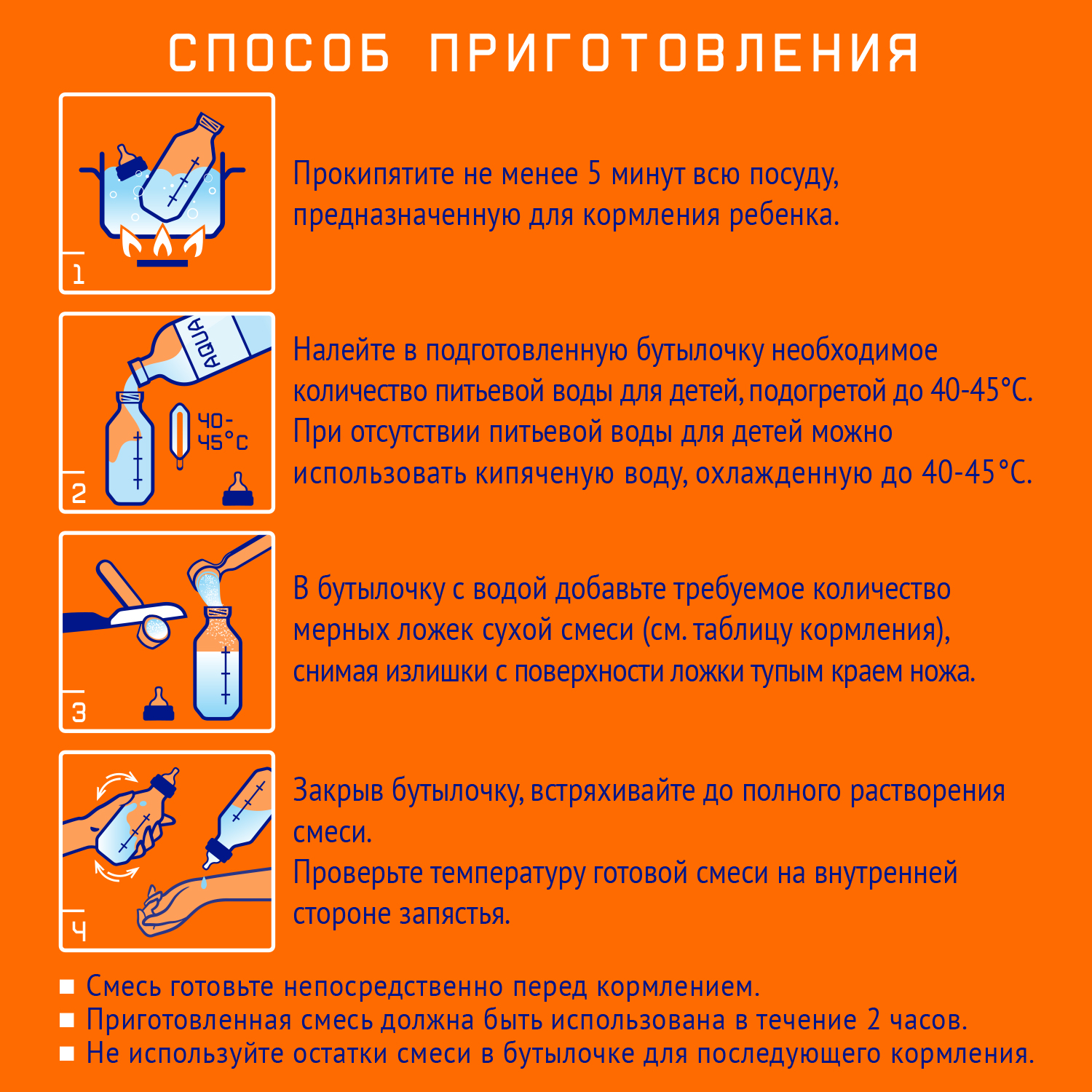| Температура смеси | Разведение порошка | Вода для кормления | Гигиена ребенка |