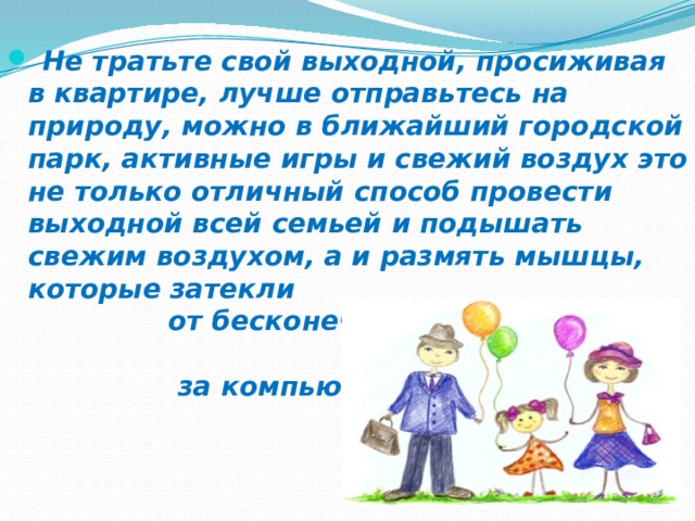Моменты, проведенные с родными, остаются в памяти надолго. Независимо от того, хотите ли вы провести день активно или в спокойной обстановке, важно создать атмосферу, которая будет способствовать сближению и радости. Разнообразие вариантов времяпрепровождения позволяет каждому члену семьи найти занятие по душе, будь то прогулка на свежем воздухе или уютное времяпрепровождение в домашних условиях.